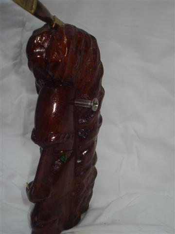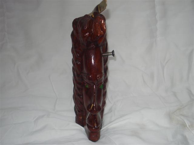 DESCRIPCION 2006 Wood from Gambia. No base or pedestal, with its head on the ground. An Afro-Elvis form with its comb in the upper echelons of ideas. Punk Frankenstein genetics in stainless steel with size 6 screw. Letter opener and two magnets. |
