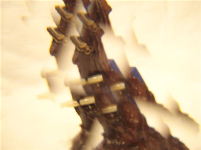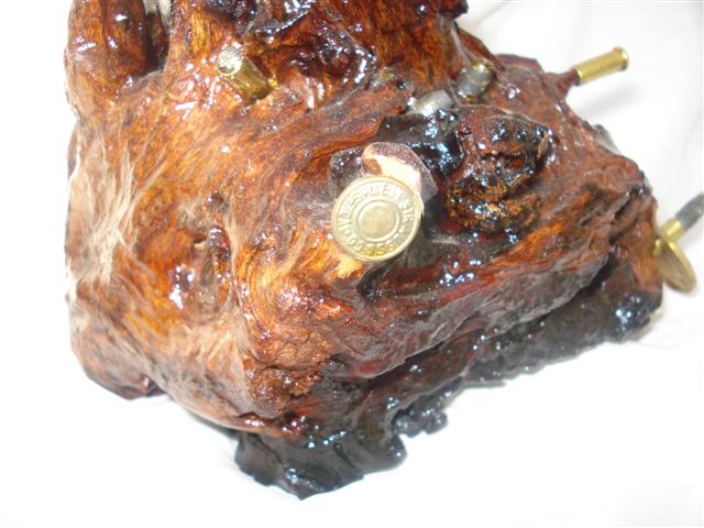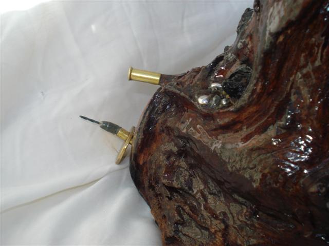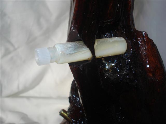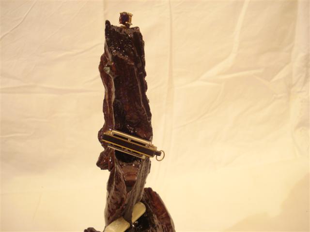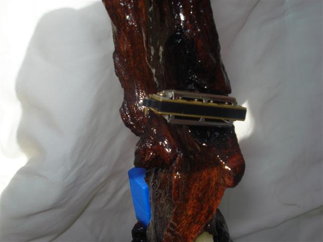 DESCRIPCION 1996 Wood is "teak and it doesn't break when it falls", i.e hard wood. And also dark and reflecting it is perhaps a mutant wood. Buttons by Levi Strauss. Hohner backpack and bucal micro-harmonica. Tube of perfume with varnish in water. |