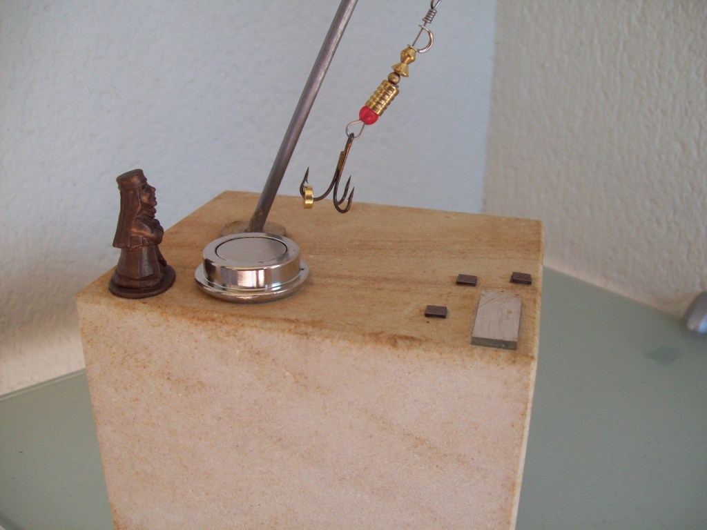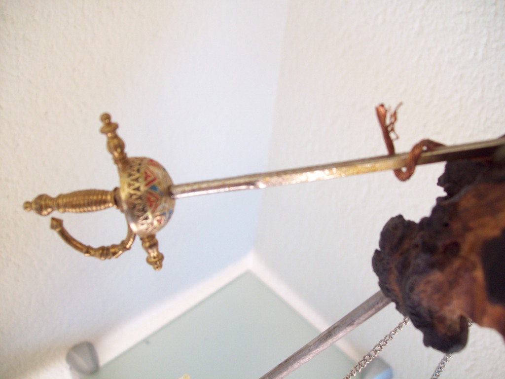 Peana Base de dama reclamando que baje a la peana Estado de animo que se intenta reflejar:Componentes Iman,espada ,colgantes,aro ,bombilla Motorizada: NO; Sonido: NO; Olor: NO; |